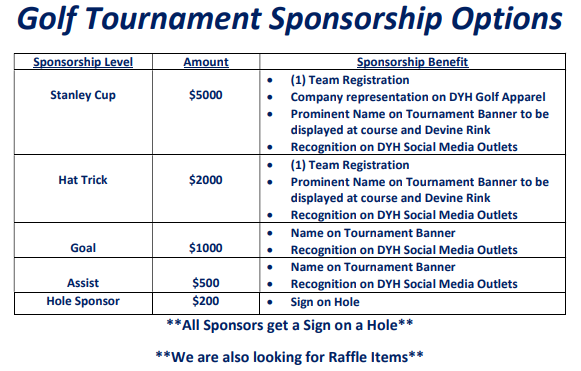 Please join us this year for our Annual Golf Tournament! All proceeds benefit Dorchester Youth Hockey and provide the necessary funds to ensure we keep our tuition as low as possible all while continuing to provide a top notch hockey program for our Dorchester familes.